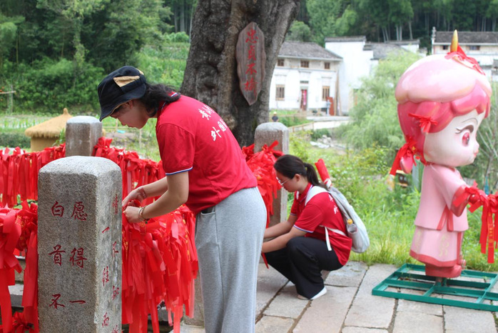 “比如‘古树祈福’,若直译便失了意境,”英语专业的戚玉璇分享巧思,“我们译为‘Blessing at Ancient Trees’,既准确传递祈福行为,又用‘Ancient’点出古树承载的悠远时光。” 对于“农耕古道”这类富含历史信息的词汇,他们舍弃冗长解释,译为直观的“Ancient Farming Path”,让外国游客一目了然。
