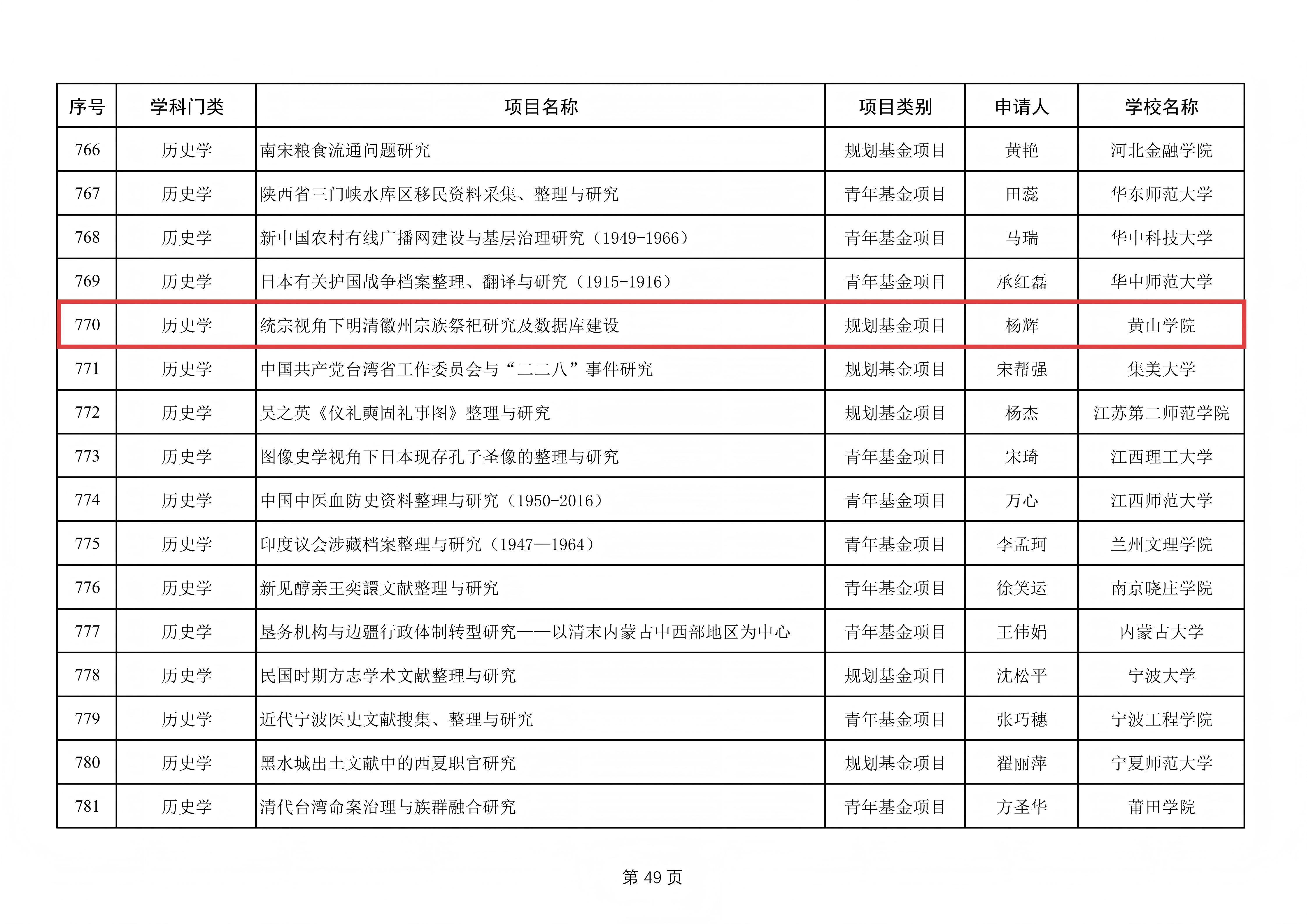 历史学 | 统宗视角下明清徽州宗族祭祀研究及数据库建设 | 规划基金项目 | 杨辉 | 黄山学院 |