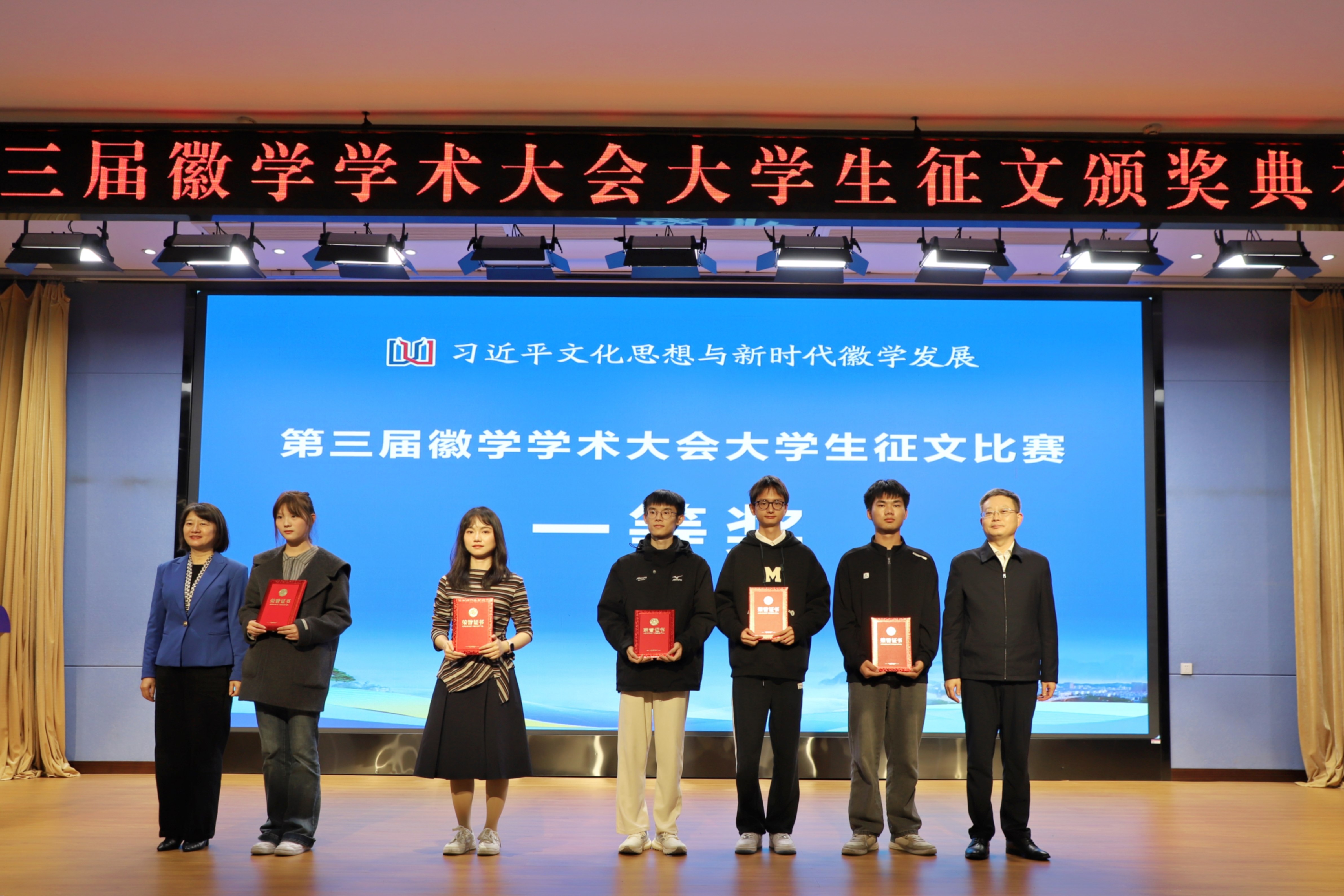 11月8日上午,第三届徽学学术大会“我眼中的徽州与徽州文化”大学生征文颁奖典礼在我校文博楼二楼报告厅举行。校党委副书记刘力,党委委员、副院长张小明,黄山市人民政府副市长江卓琪,省社科联秘书长韩修良,黄山市社科联党组书记、主席汪明洁,安徽大学徽学研究中心总支书记张鑫出席典礼。获奖学生代表、黄山学院师生代表参加典礼。典礼由张小明主持。